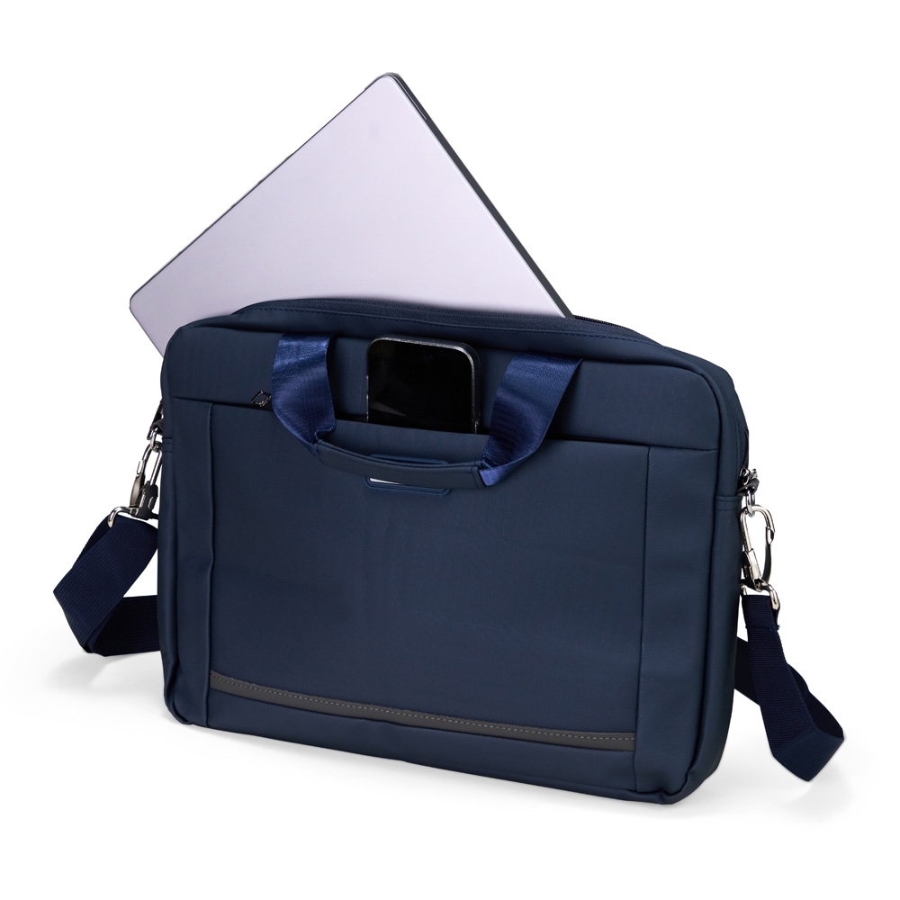 - dois compartimentos: o principal, com revestimento acolchoado, quatro bolsos abertos de tamanhos diferentes e duas divisórias para canetas;
