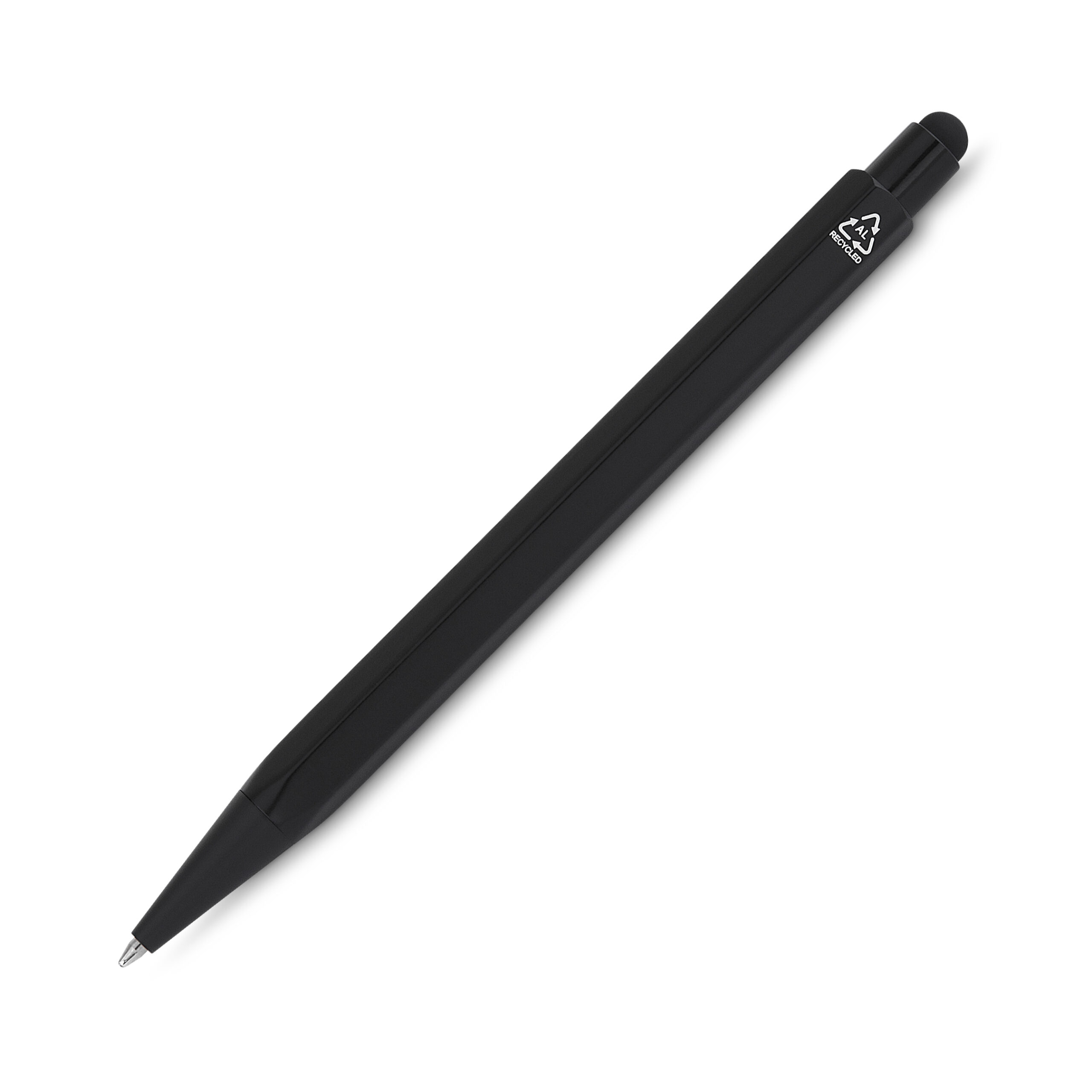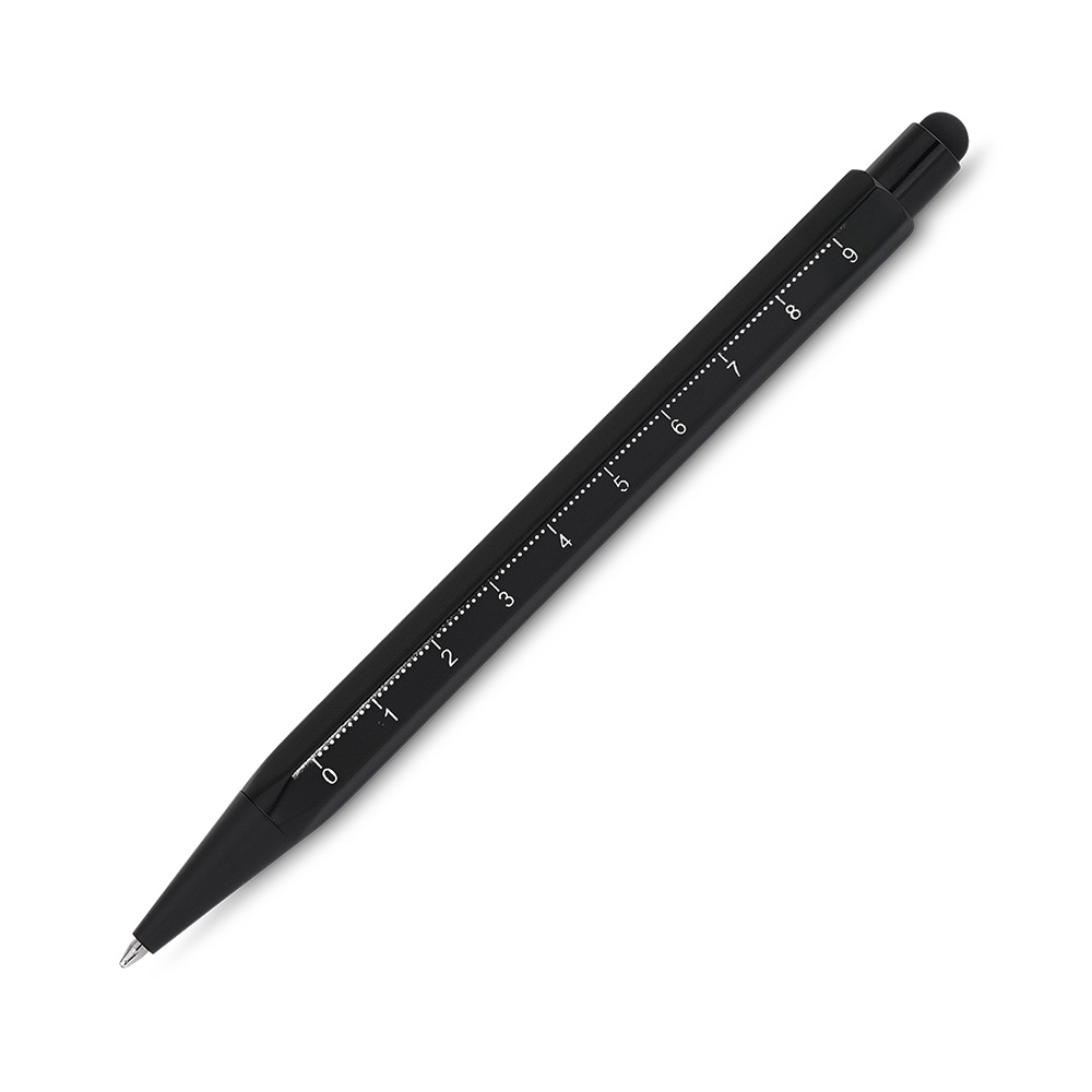 - caneta de acionamento em alumínio reciclado, com régua no corpo e sem clipe;